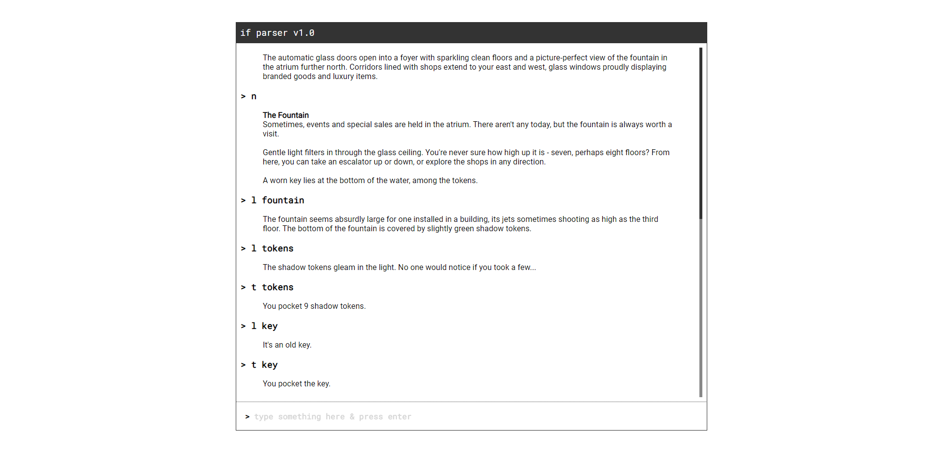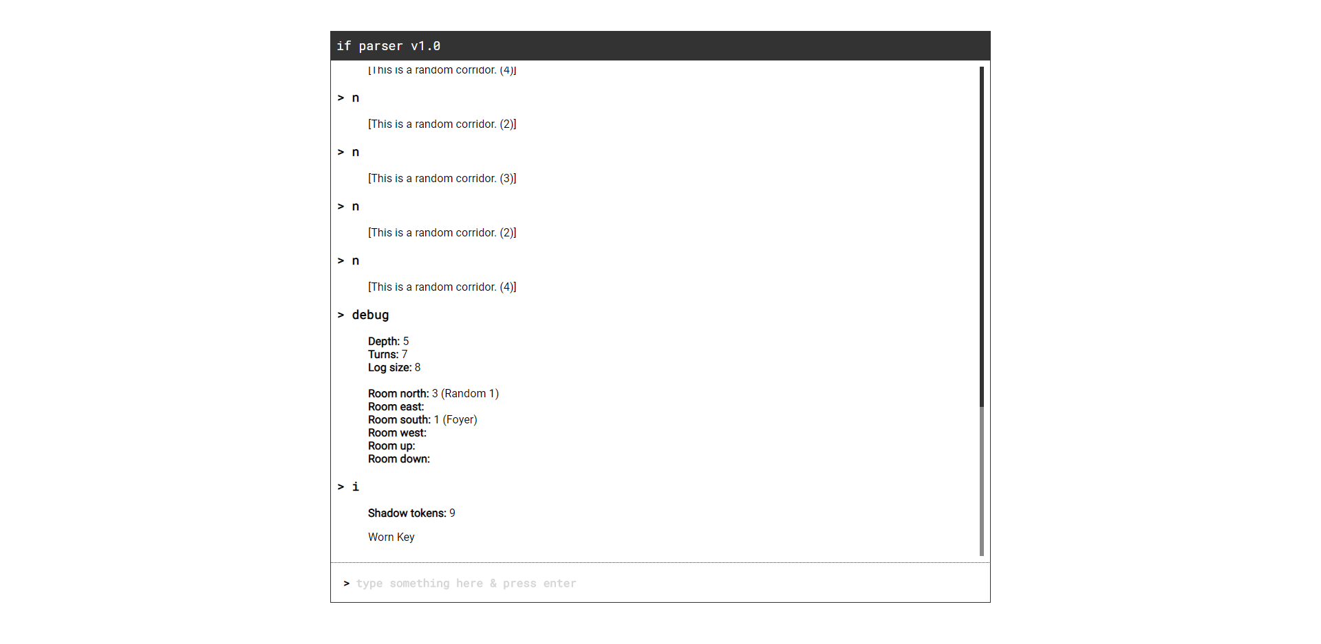 This is a Javascript-based engine for a procedurally-generated world to be navigated in a manner similar to interactive fiction engines, i.e. by typing commands/directions.